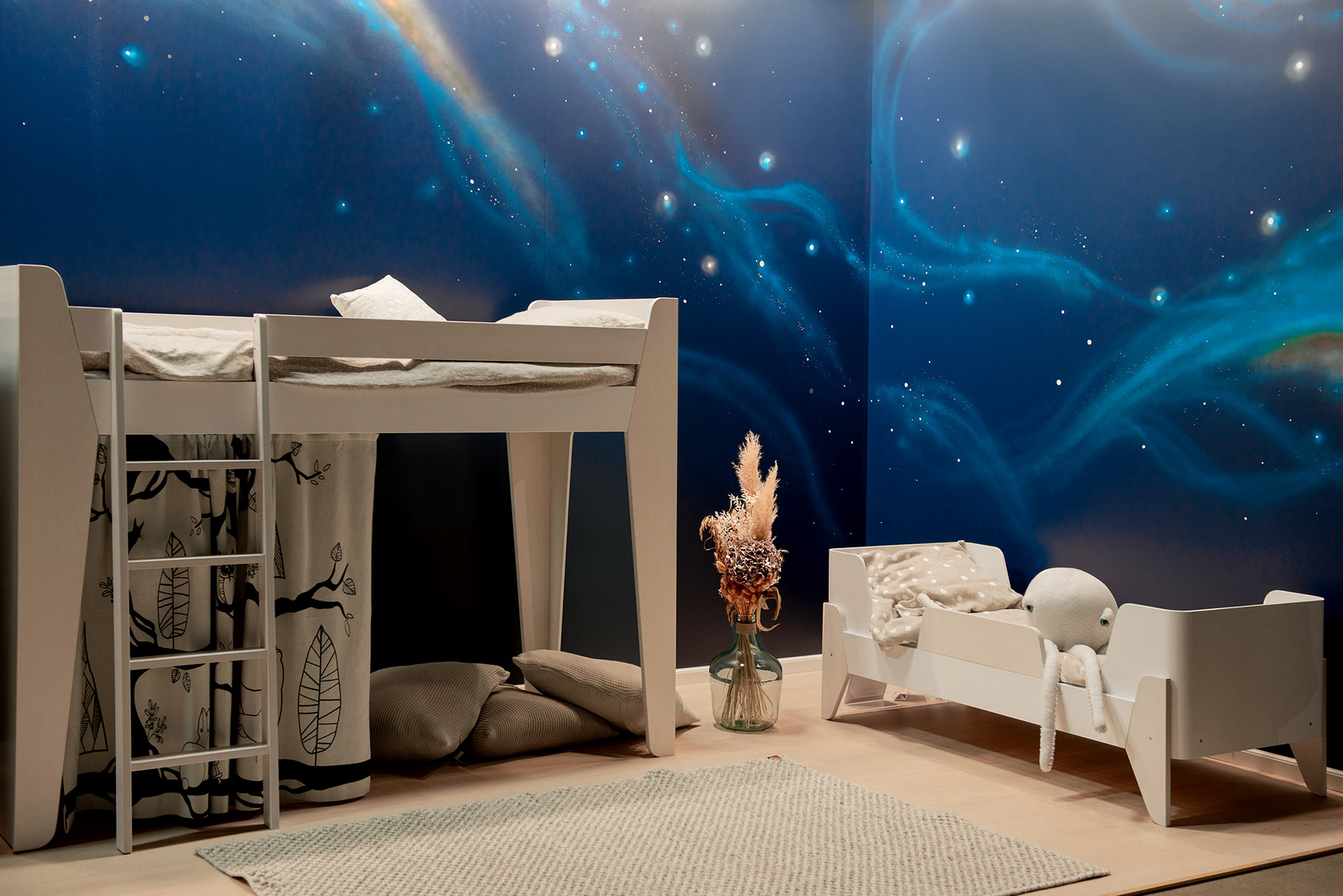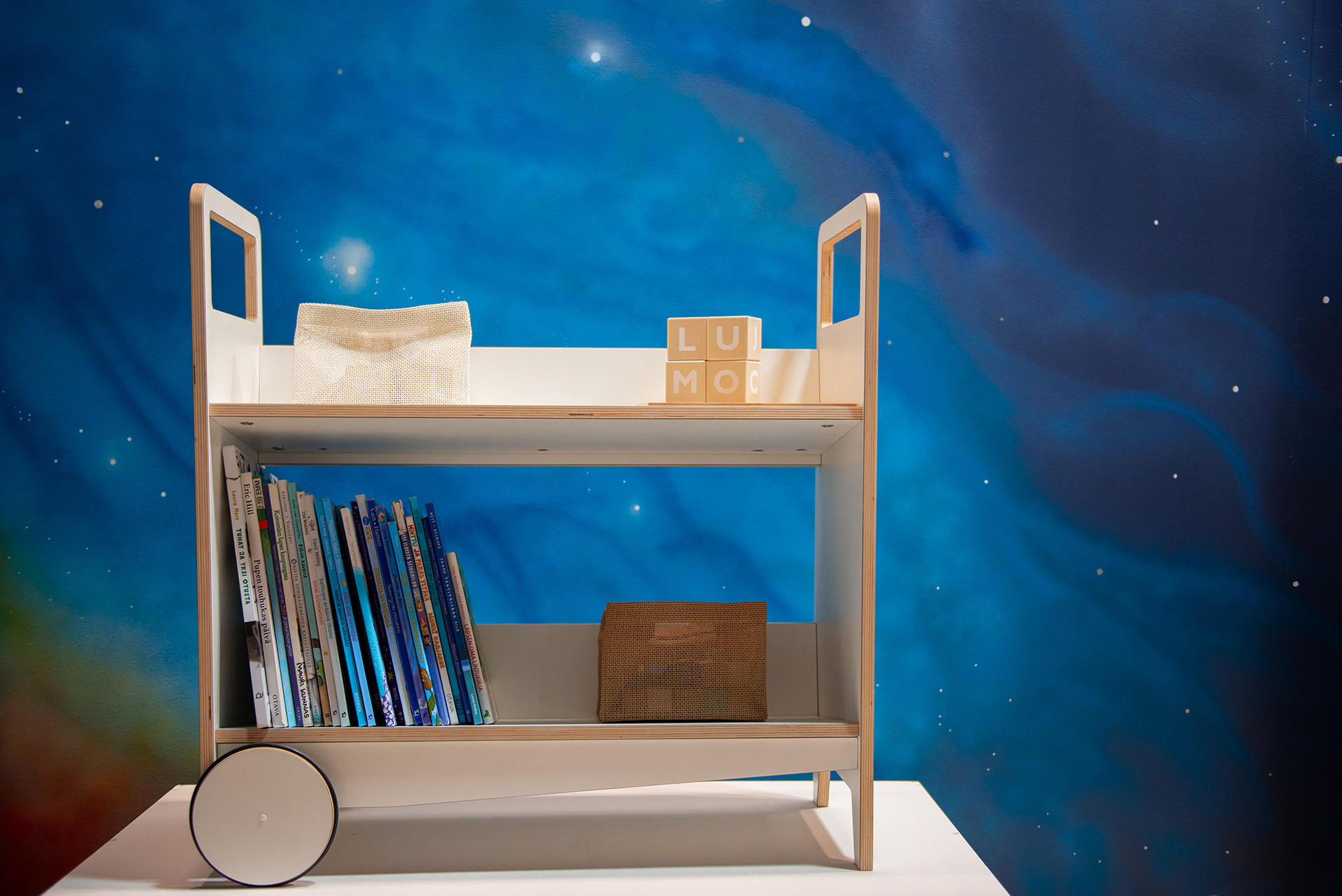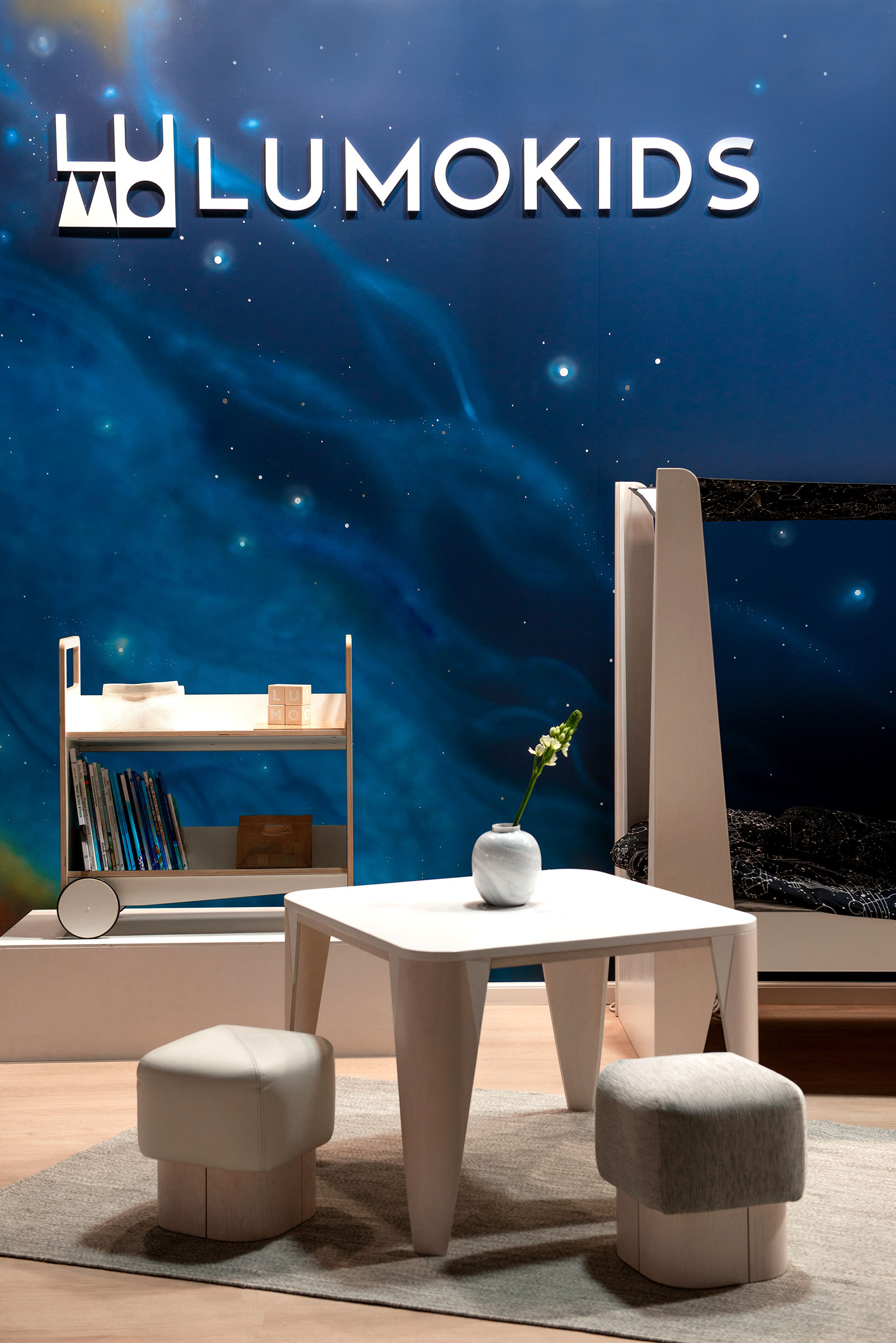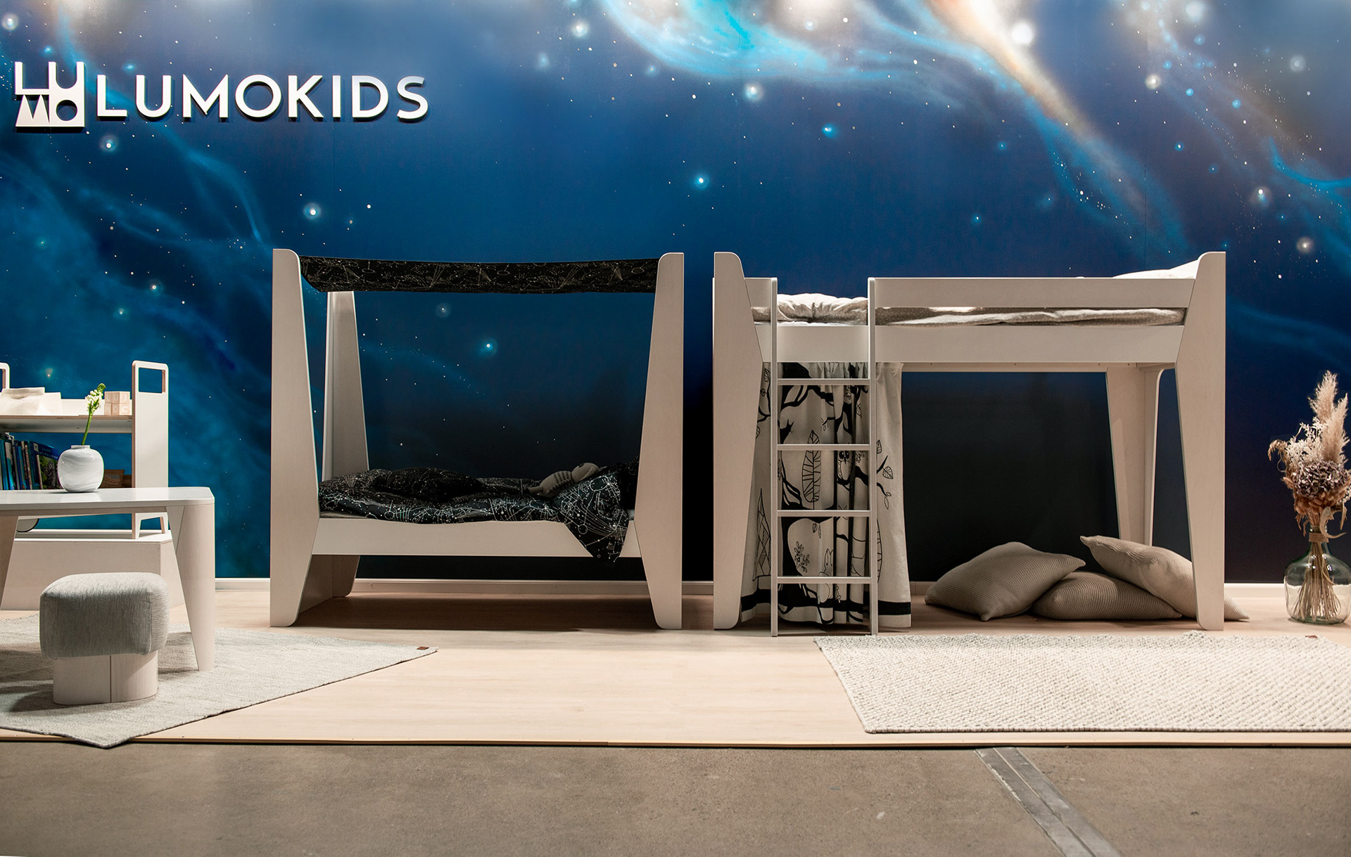 Custom painted starsky for childrens design furniture brand LUMOKIDS fair stand at HABITARE 2019. Finlands largest Interior design and Furniture fair.